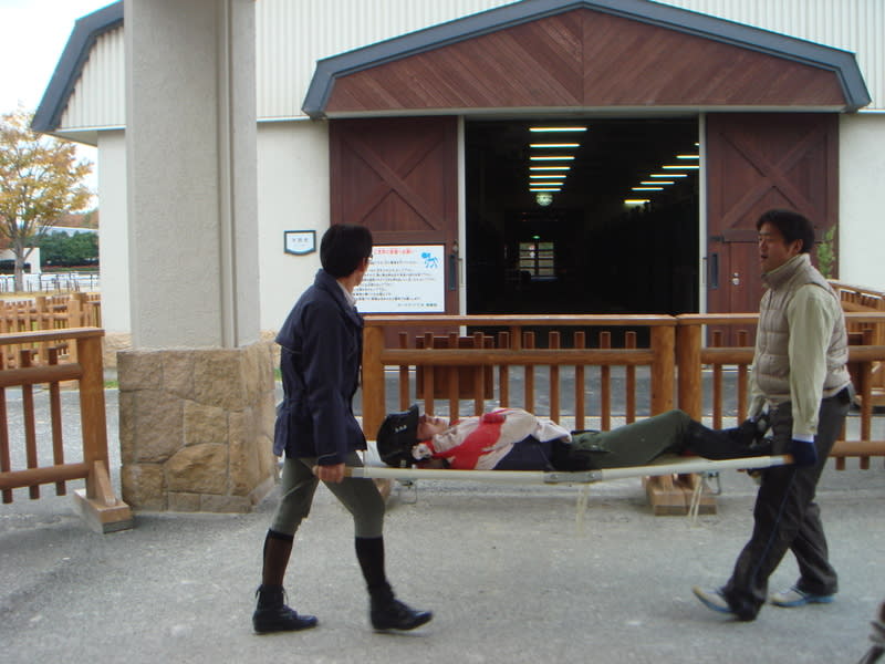 火災と同時に起きた落馬事故により負傷した受講生を応急処置し、安全な場所へ搬送します。