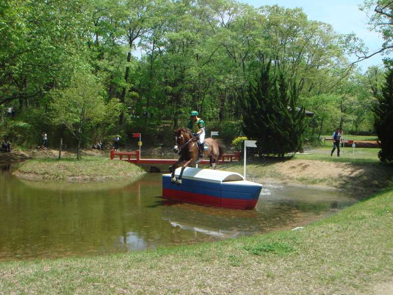 障害物のひとつ、水濠障害(すいごうしょうがい)=(例)上写真3つめ は、下り坂を下りながら水濠に飛び込み、障害物を飛越するなど、騎乗者の技術・馬の体力などが問われます。