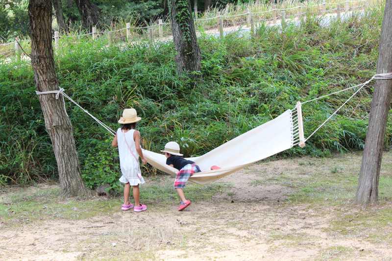 森の中では、ハンモック・むかしあそび・おもしろ自転車で遊べます。