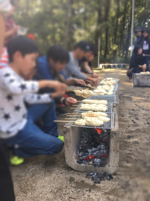 竹串にパン生地を巻きつけて、炭火で焼きます。