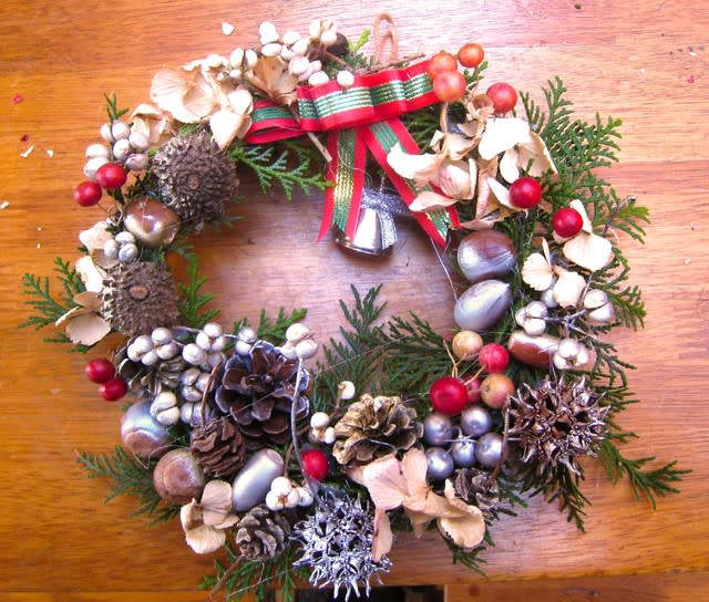 ヒノキの葉っぱ、松ぼっくり、どんぐり、ナンキンハゼの実、サルトリイバラの実、シーダーローズなどの様々な自然材料で飾り付けをしました
